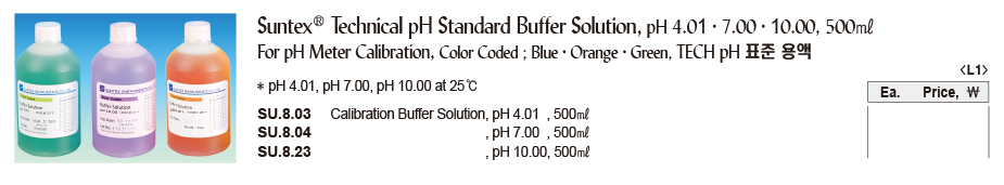 Suntex® Technical pH Standard Buffer Solution, pH 4.01·7.00·10.00, 500㎖ For pH Meter Calibration, Color Coded ; Blue·Orange·Green, TECH pH 표준 용액