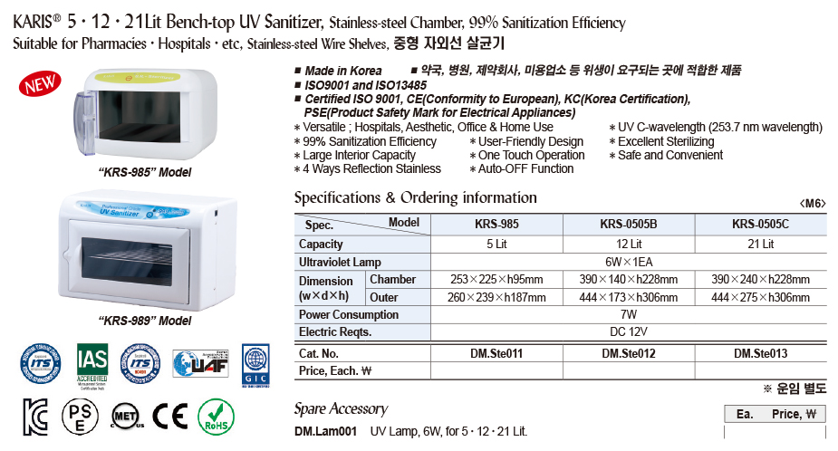 KARIS 5·12·21Lit Bench-top UV Sanitizer, Stainless-steel Chamber, 99% Sanitization Efficiency